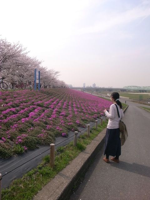 荒川の桜並木、土手側は一面芝桜!